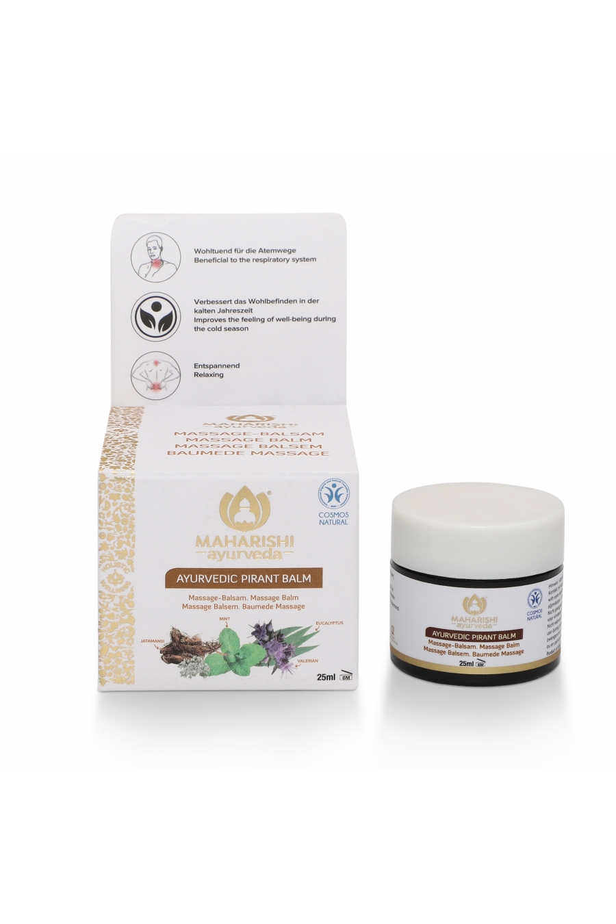 Aceite de semilla de Sesamum indicum*, leche de vaca, resina de Dryobalanops camphora, cera de abejas, mentol, timol, aceite de corteza de Cinnamomum zeylanicum**, aceite de hoja de Eucalyptus globulus**, aceite de flor de Eugenia Caryophyllus**, aceite de Foeniculum vulgare**, , extracto de raíz de Asparagus racemosus, extracto de raíz de Rubia cordifolia, cloruro de sodio, extracto de raíz de Asparagus adscendens, extracto de raíz de Inula racemosa , extracto de hoja de Nyctanthes arbor-tristis, extracto de Solanum indicum, extracto de raíz de Withania somnifera, extracto de hoja de Adhatoda vasica, extracto de hoja de Pluchea lanceolata, extracto de raíz de Pueraria tuberosa, extracto de raíz de Valeriana wallichii, extracto de raíz de Boerhaavia diffusa, extracto de raíz de Glycyrrhiza glabra, extracto de semilla de Butea frondosa, extracto de Eclipta alba, extracto de Oroxylum indicum extracto de corteza, extracto de Abutilon indicum, Mesua Extracto de flor de ferrea, extracto de Solanum xanthocarpum, extracto de raíz de Curcuma longa, extracto de Paederia foetida, extracto de fruto de Anethum sowa, extracto de Teramnus labialis, fruto de Tribulus terrestris, extracto de Uraria picta, extracto de hoja de Cinnamomum tamala, extracto de semilla de Elettaria cardamomum, extracto de tallo de Tinospora cordifolia, extracto de Premna serratifolia, extracto de Sida cordifolia, extracto de tallo de Berberis aristata, extracto de Phaseolus trilobus, extracto de corteza de Stereospermum suaveolens, extracto de raíz de Cyperus rotundus, extracto de raíz de Curcuma aromatica, extracto de Desmodium gangeticum, extracto de raíz de Nardostachys jatamansi, extracto de madera blanca de Santalum, extracto de corteza de Aegle marmelos, extracto de madera de Cedro deodara, Eugenol***, Cinamal***, Limoneno***, Linalool***, Benzoato de bencilo***, Isoeugenol***.